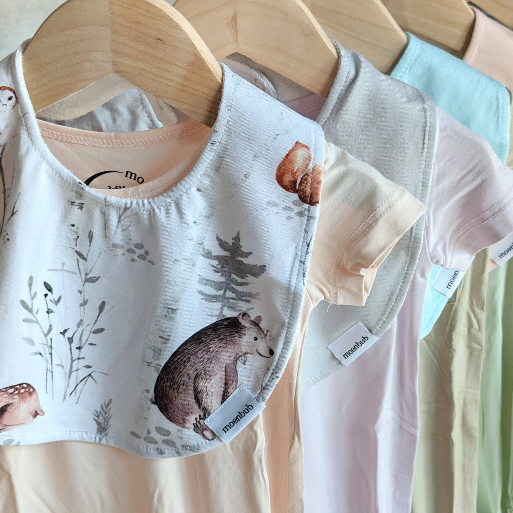 Our moonbub reversible bibs are made of buttery soft and breathable bamboo viscose fabric on one side, and bamboo terry towelling on the other.